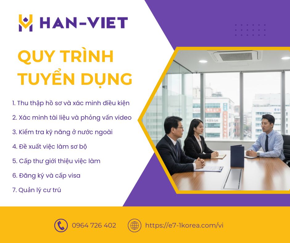 Chương trình được thiết kế theo mô hình “một cửa”, trong đó toàn bộ quy trình được chuẩn hóa theo tiêu chuẩn tuyển dụng của doanh nghiệp Hàn Quốc. Ứng viên bắt đầu từ bước xác minh hồ sơ, kiểm tra tài liệu và phỏng vấn video để đánh giá trình độ tiếng Hàn, năng lực chuyên môn, kỹ năng nghề nghiệp và khả năng thích ứng. Những hồ sơ phù hợp sẽ được đề xuất việc làm sơ bộ, tiếp tục hoàn thiện hồ sơ để nhận thư giới thiệu chính thức từ doanh nghiệp Hàn Quốc, sau đó được hỗ trợ toàn diện trong quá trình xin visa, sang Hàn và ổn định cư trú lâu dài.